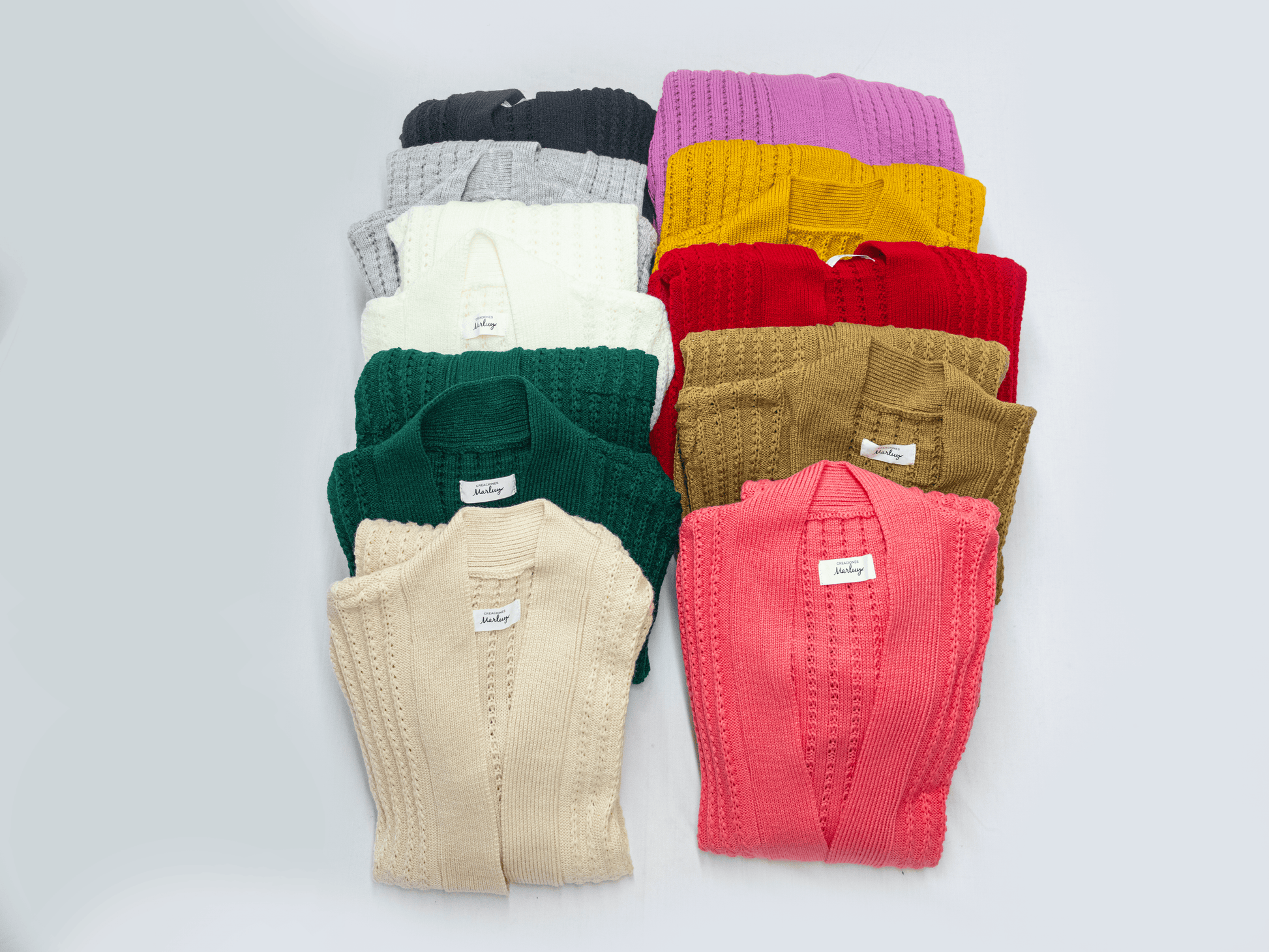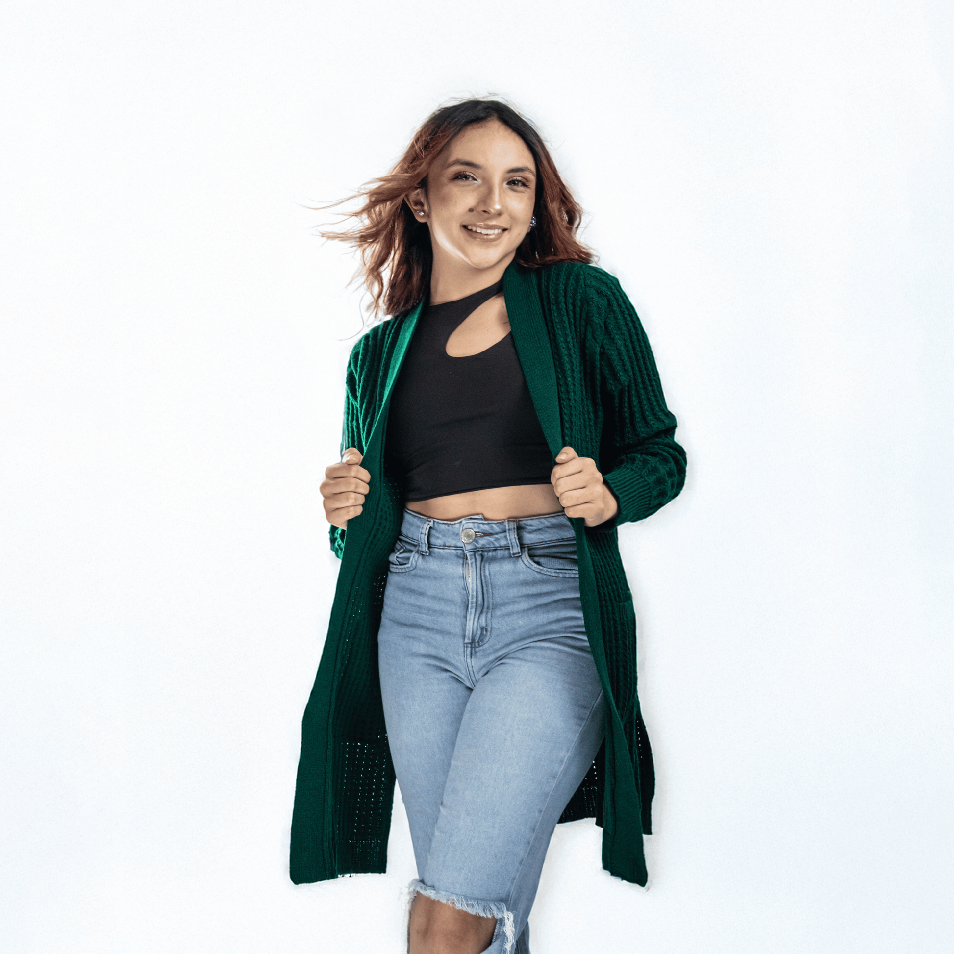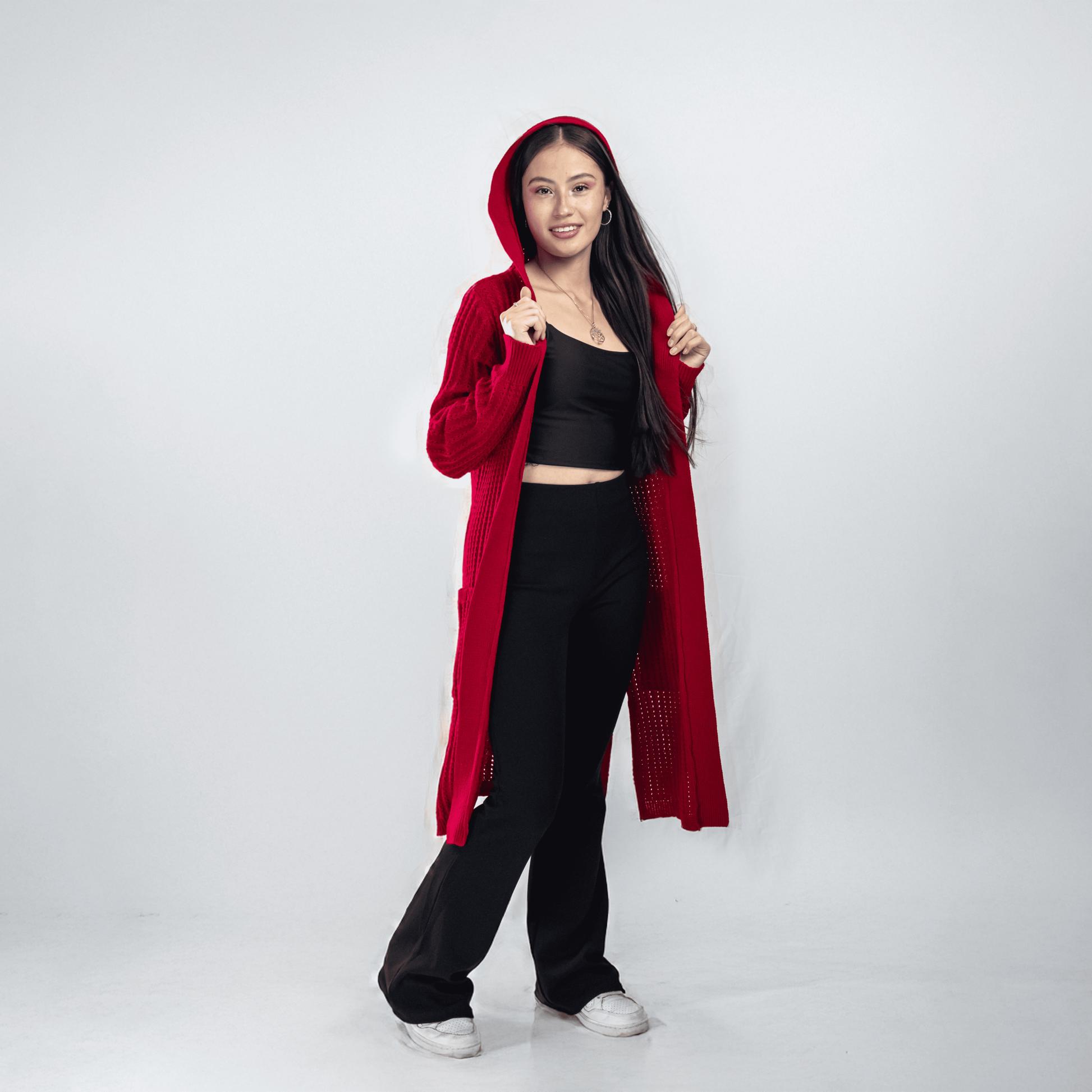 Gaban largo en tejido de puntada, con capota y diseño con ligeras aberturas a los costados en la parte inferior.